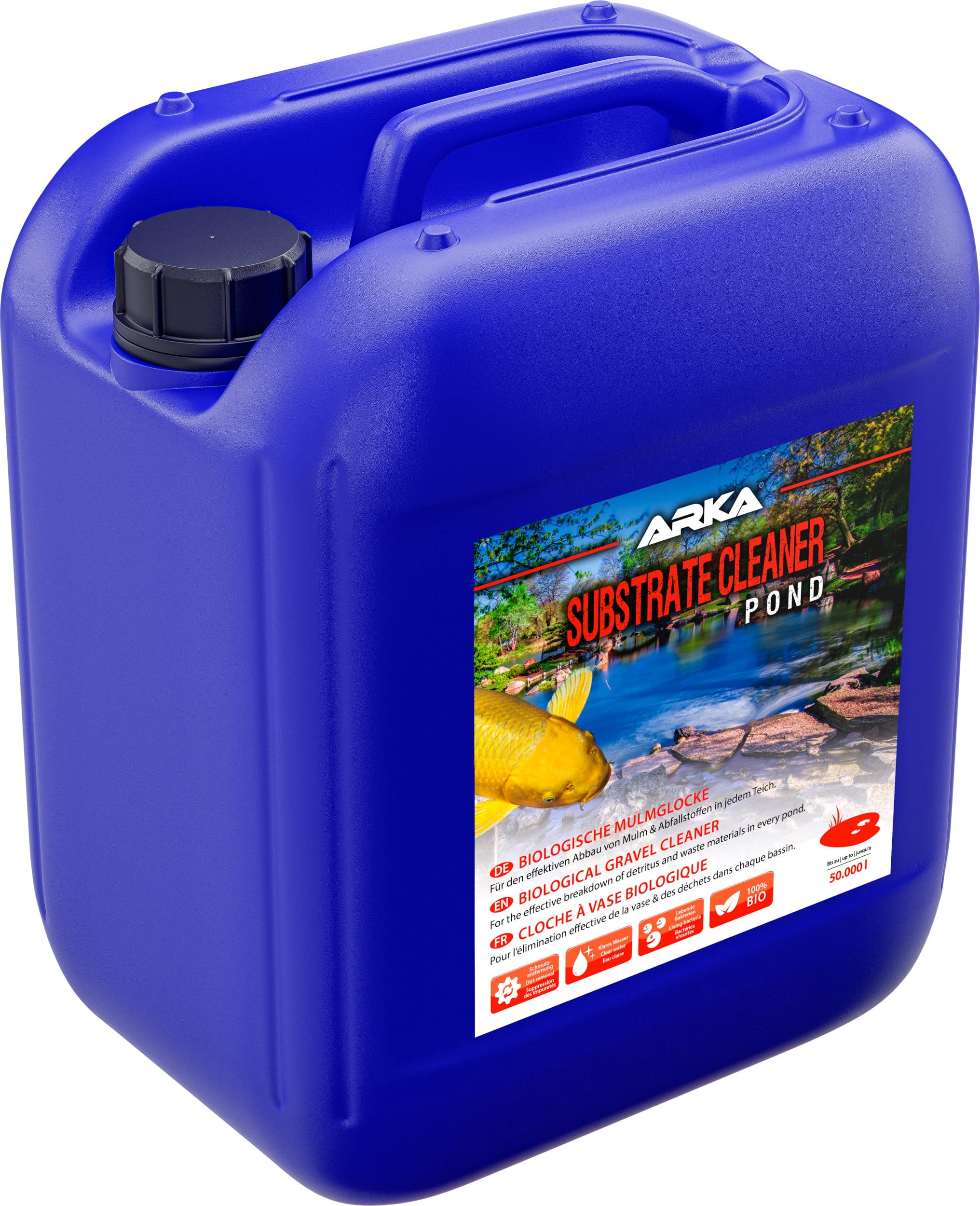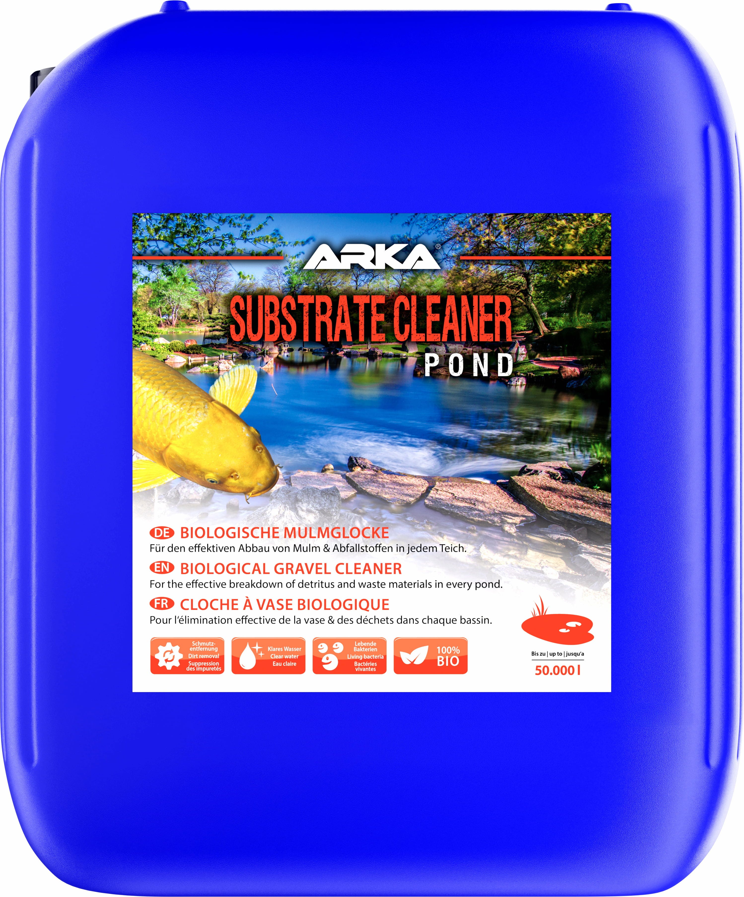 Substrate Cleaner Pond von ARKA funktioniert als äußerst effektive, 100 Prozent biologische Reinigungskraft für Teiche: Es enthält speziell entwickelte Bakterien, die Mulm und andere organische Abfallstoffe im Bodengrund beseitigen. Schädliche gasförmige Verbindungen lösen sich auf, Phosphat- sowie Nitratdepots werden vollständig aufgespalten. Auch bei Bodengründen, die ein mechanisches Absaugen erschweren, beispielsweise Stein- bzw. Kiesböden, arbeiten die Bakterien zuverlässig. Das Substrat beginnt ab einer Wassertemperatur von 7 °C zu wirken. Anfangs kann das Präparat eine harmlose Wassertrübung verursachen, nach 24 bis 72 Stunden ist das Wasser jedoch gereinigt und klar.