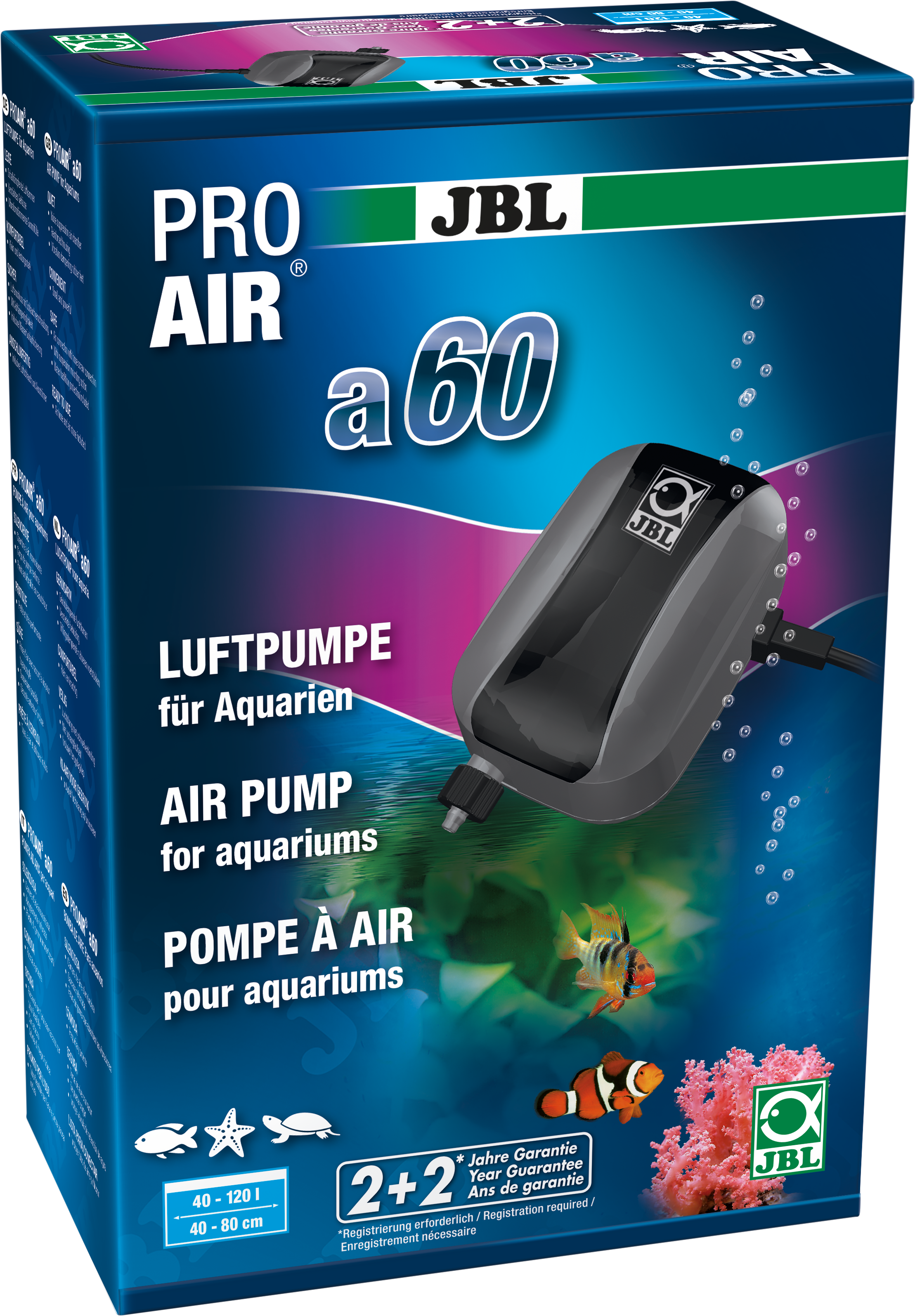 Die JBL ProAir a60 ist das ideale Einsteigermodell für Aquarien zwischen 40 und 120 Litern und kommt als komplett anschlussfertiges Set direkt zu dir nach Hause! Du musst dich nicht um Zubehör kümmern, denn vom 2 Meter langen Luftschlauch über das Rückschlagventil bis hin zum Ausströmerstein ist bereits alles im Paket enthalten. Damit die entspannte Atmosphäre an deinem Aquarium nicht gestört wird, arbeitet dieses Gerät flüsterleise.