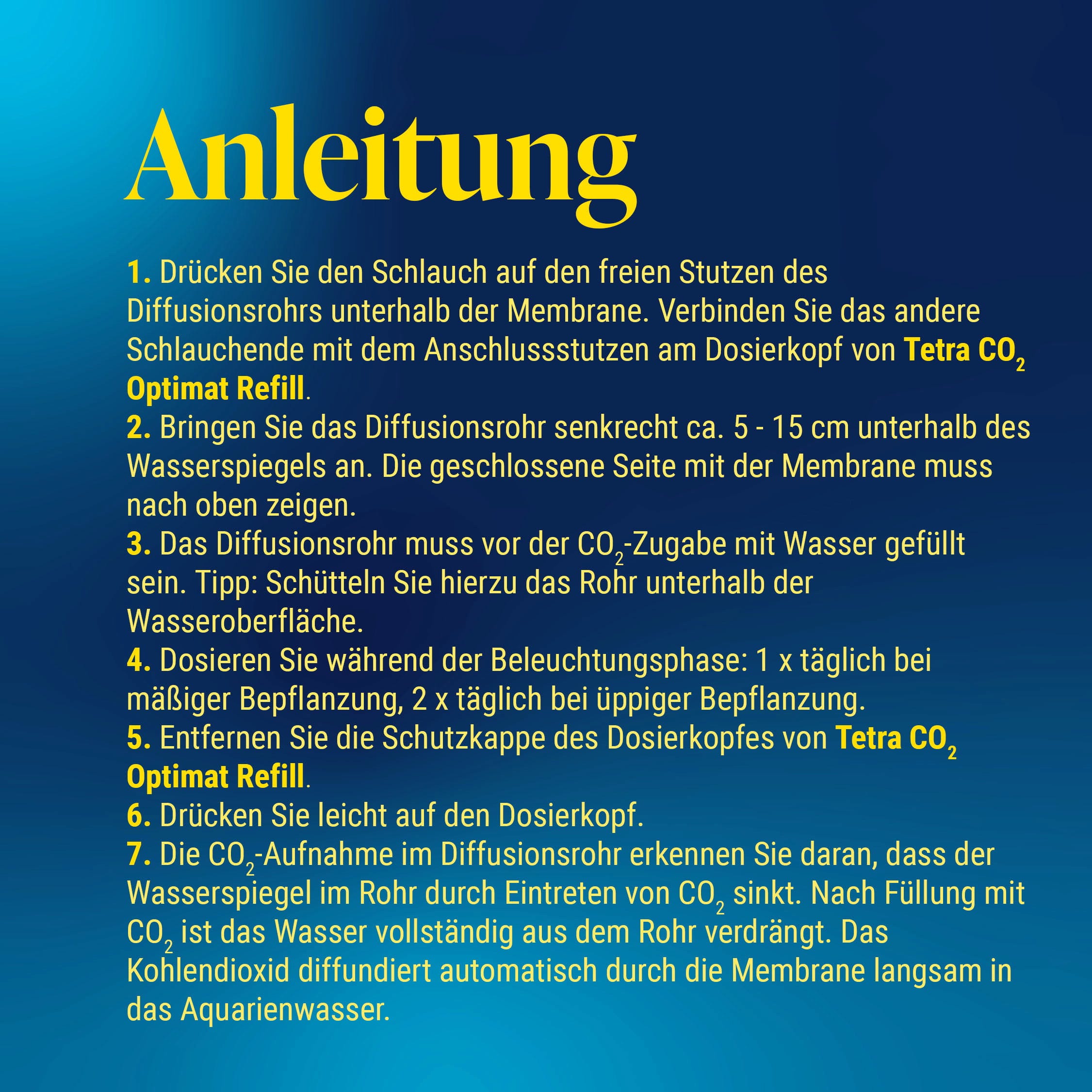 - Drücke dazu leicht auf den Dosierkopf, bis das Wasser vollständig aus dem Rohr verdrängt wurde. Das Gas diffundiert anschließend automatisch und langsam durch die Membrane in das Aquarienwasser.