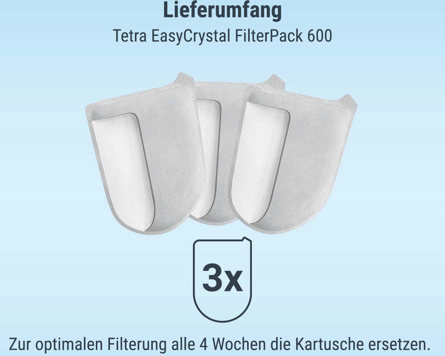 Der Tetra EasyCrystal FilterPack 600 dient der mechanischen und biologischen Wasseraufbereitung von Aquarien mit einem Volumen von 50-100 Litern und ist für den Einsatz im Tetra EasyCrystal FilterBox 600 bestimmt.