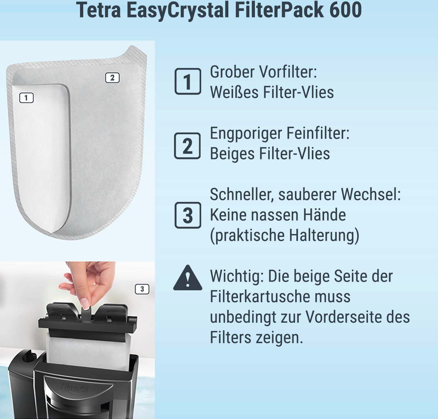 Mit dem Tetra EasyCrystal FilterPack 600 bleiben die Hände bei der Filterreinigung komplett trocken - noch nie war es einfacher, schnell und zuverlässig Filtermedien mit nur einem Griff auszutauschen!