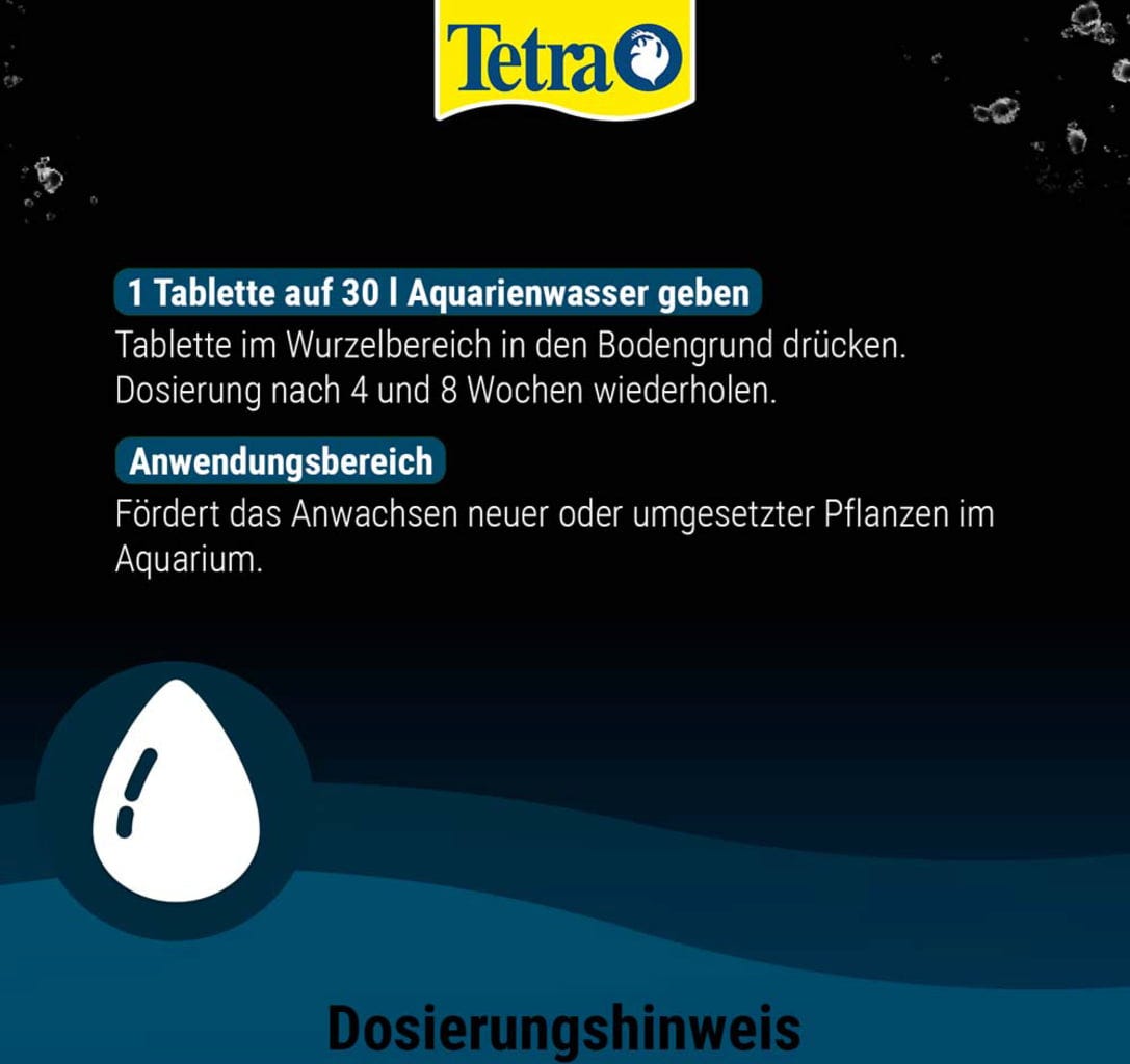 1 Tablette auf 30 Liter Aquarienwasser geben. Tablette im Wurzelbereich in den Bodengrund drücken. Dosierung nach 4 und 8 Wochen wiederholen.