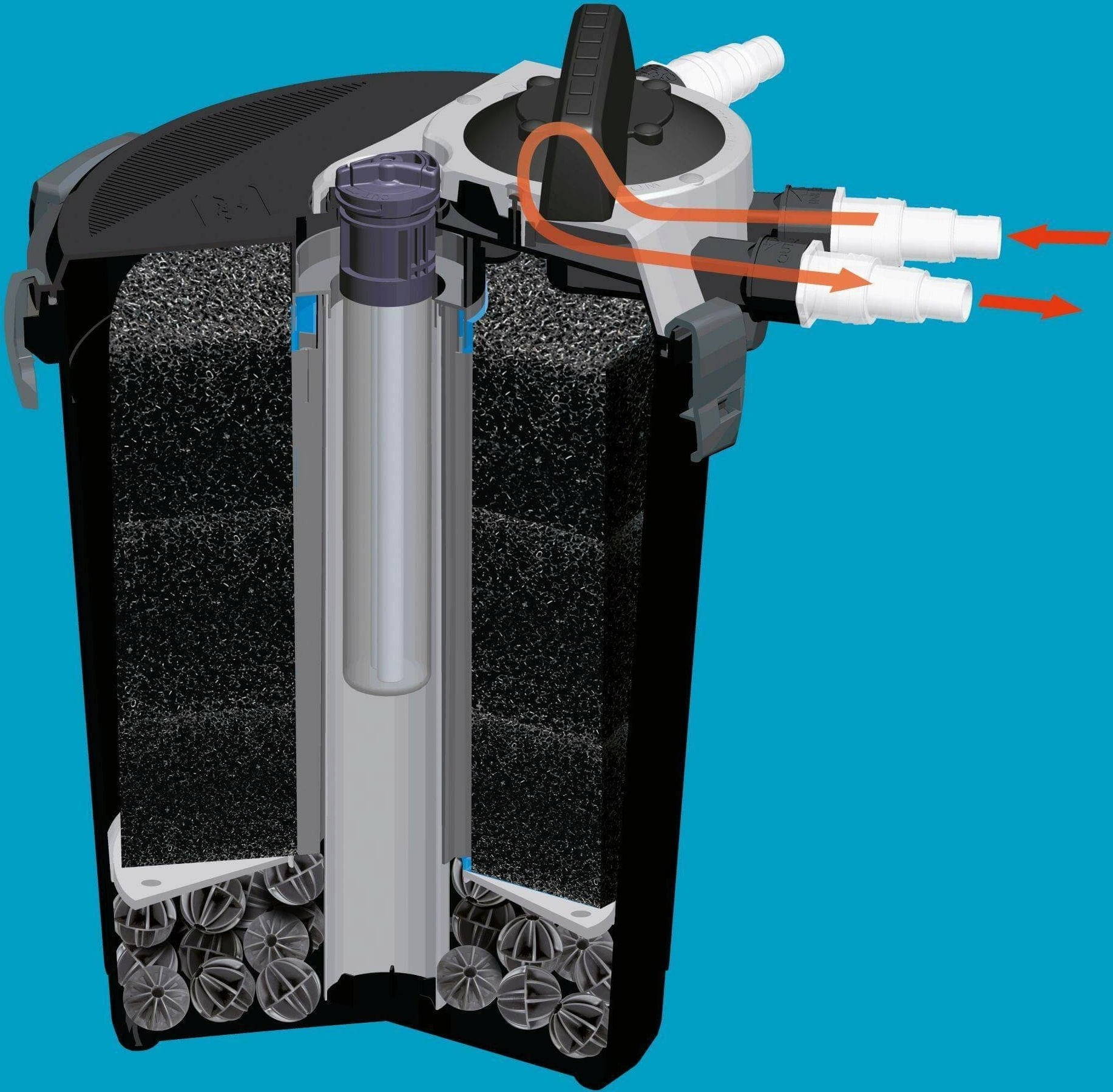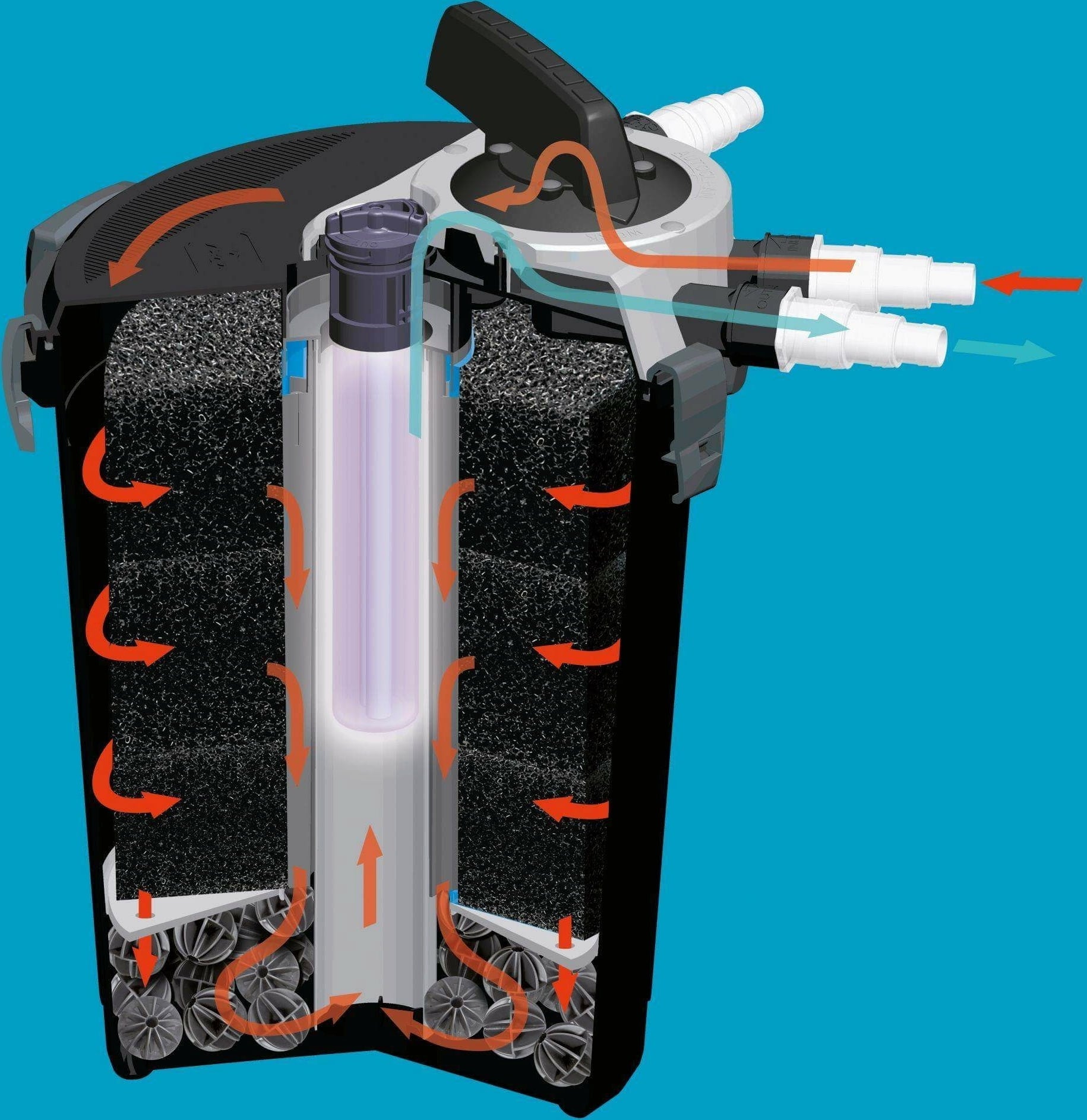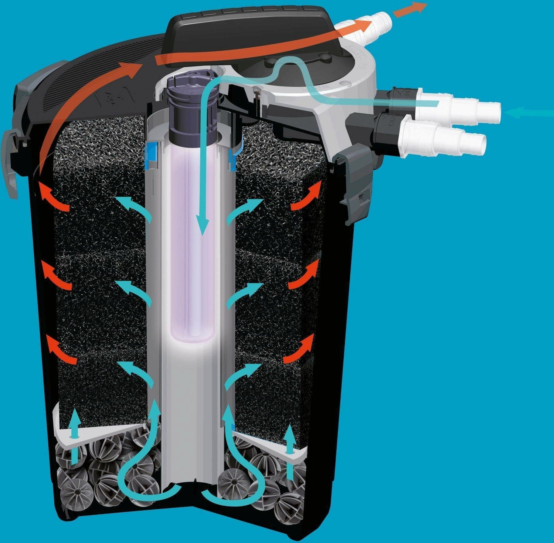 Zodra het KLARPRESSURE UV-filter zich in het water bevindt, loopt het water door drie lagen spons, die vaste onzuiverheden verwijdert. Vervolgens ondergaat het biologische filtratie. Bij de filteruitlaat wordt het water gesteriliseerd.