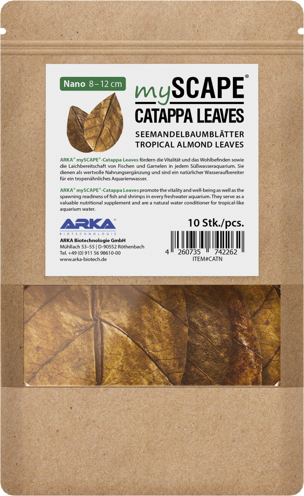 ARKA® mySCAPE®-Catappa Leaves bevordert de vitaliteit, het welzijn en de paaibereidheid van vissen en garnalen in zoetwateraquaria. Ze dienen als waardevol voedingssupplement en zijn een natuurlijke waterconditioner voor tropisch aquariumwater.