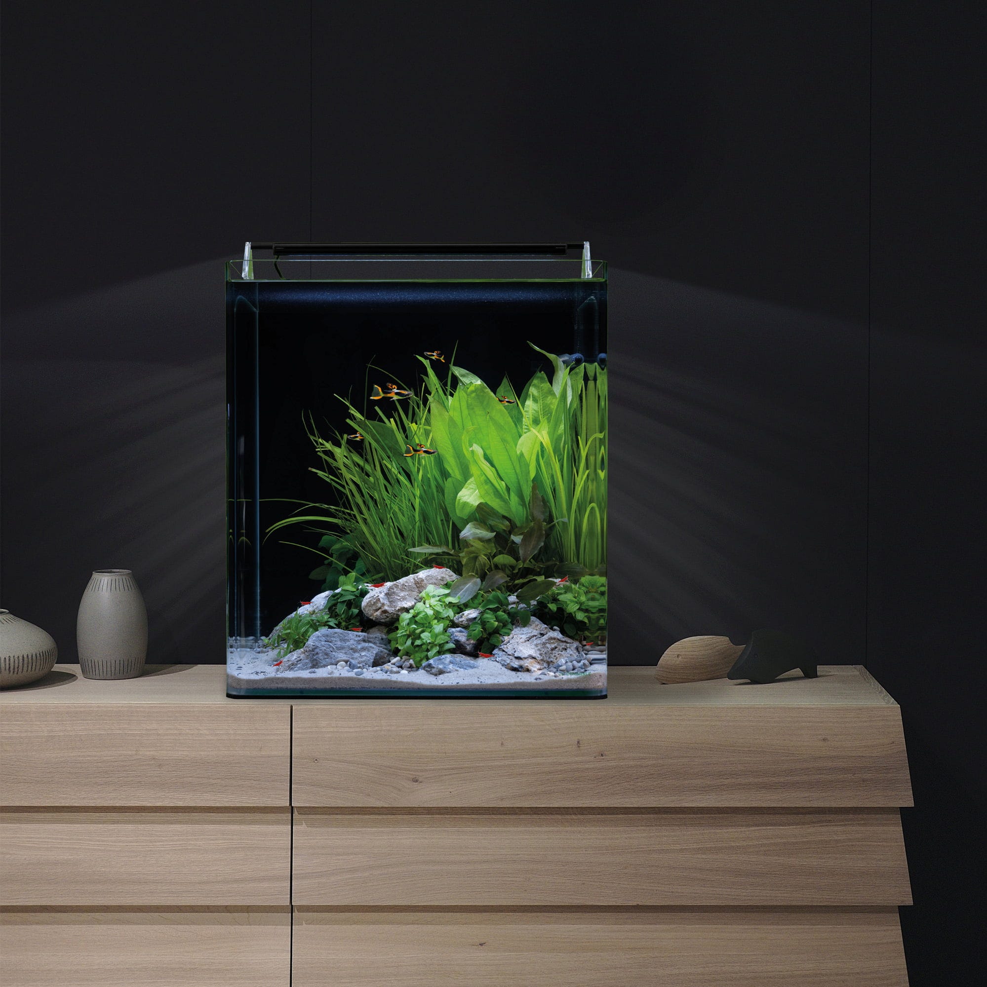 Met de Dennerle Nano Cube Basic creëer je jouw eigen onderwaterwereld op een klein oppervlak! Het middelpunt is het hoogwaardige glazen aquarium dat, dankzij de naadloos gebogen voorhoeken, een fascinerend diepte-effect creëert en je een onbelemmerd panoramisch zicht op je garnalen en slakken geeft.