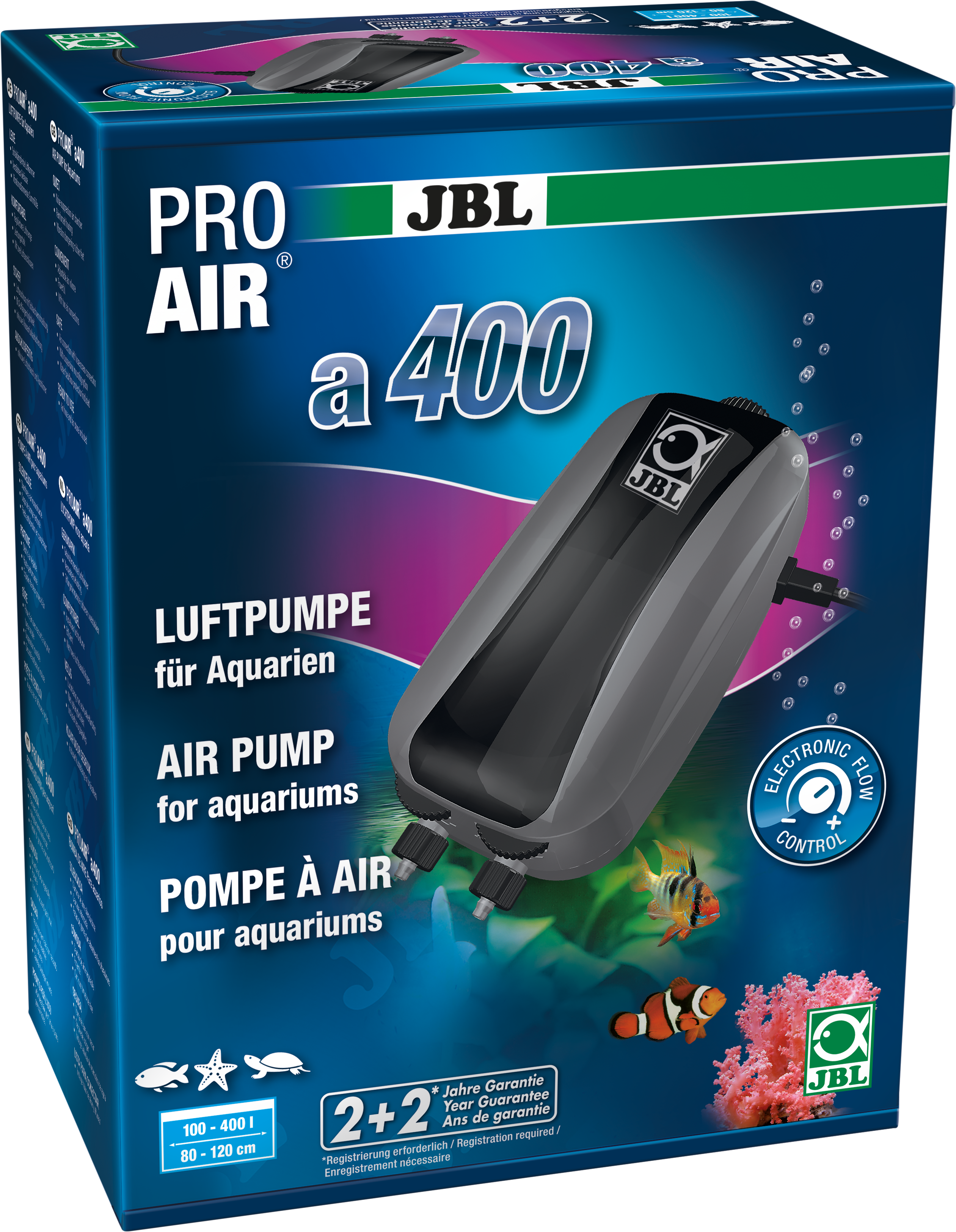 Ben je op zoek naar een krachtige én fluisterstille oplossing om je aquarium van zuurstof te voorzien? De JBL ProAir a400 is een complete, gebruiksklare set met een luchtcapaciteit van 400 liter per uur en een werkdruk van meer dan 140 mbar. Dankzij de twee afzonderlijk regelbare luchtuitlaten stem je de beluchting perfect af op de behoeften van jouw onderwaterwereld.