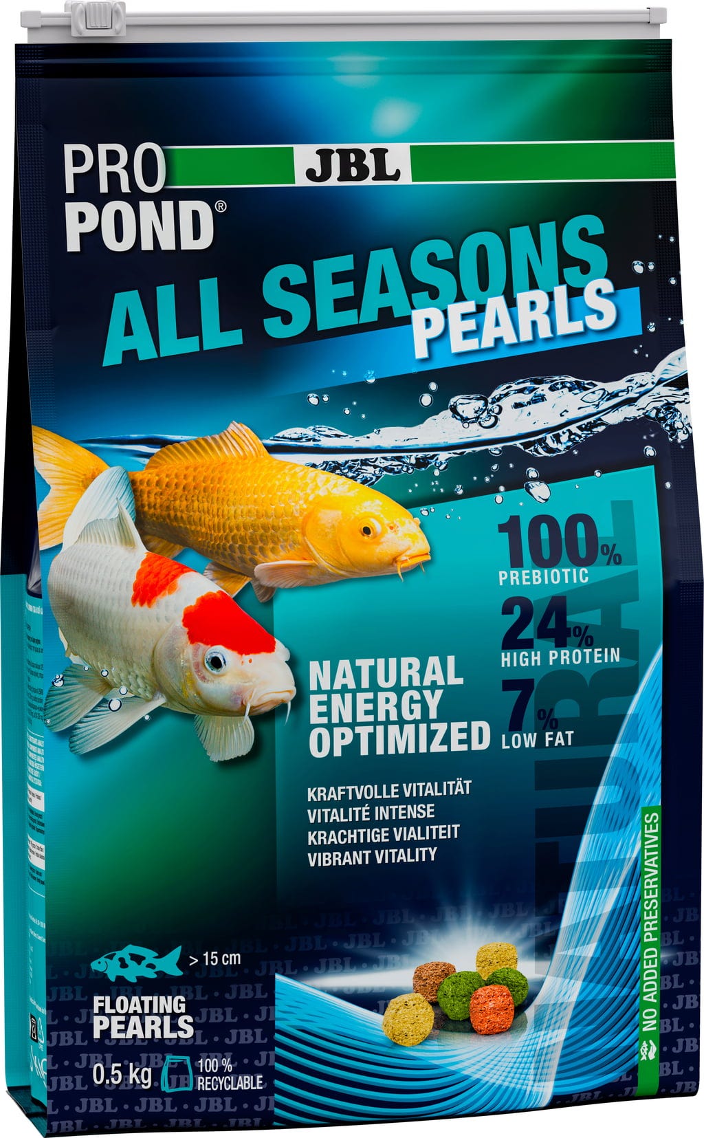 De ProPond All Seasons Pearls van JBL zijn een praktisch compleetvoer in granulaatvorm dat het hele jaar door gevoerd kan worden. Het is geschikt voor alle vijvervissen, inclusief koi, goudvissen en sluierstaarten.