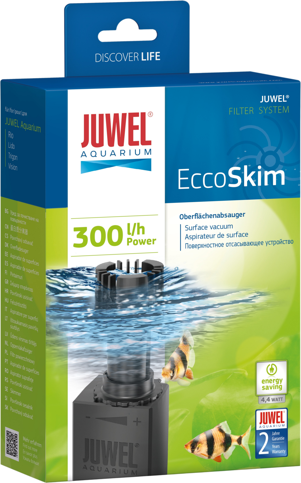De Juwel EccoSkim oppervlakteafschuimer is een compacte en energiebesparende oppervlakteafschuimer voor alle aquaria. Het combineert de productvoordelen van een oppervlakteskimmer met een compacte vorm en een hoge, instelbare oppervlaktezuigkracht. Met een vermogen van 300 l/u en een verbruik van slechts 4,4 watt zorgt de EccoSkim voor een effectieve oppervlakteafschuiming in zoet- en zeewateraquaria. De zuigkracht van de EccoSkim verwijdert in zeer korte tijd schuim en andere organische resten van het wateroppervlak. Zonder schuim en andere onzuiverheden bereikt er meer licht het substraat, wat weer het zuurstofgehalte verhoogt en de vitaliteit van uw planten en vissen bevordert!