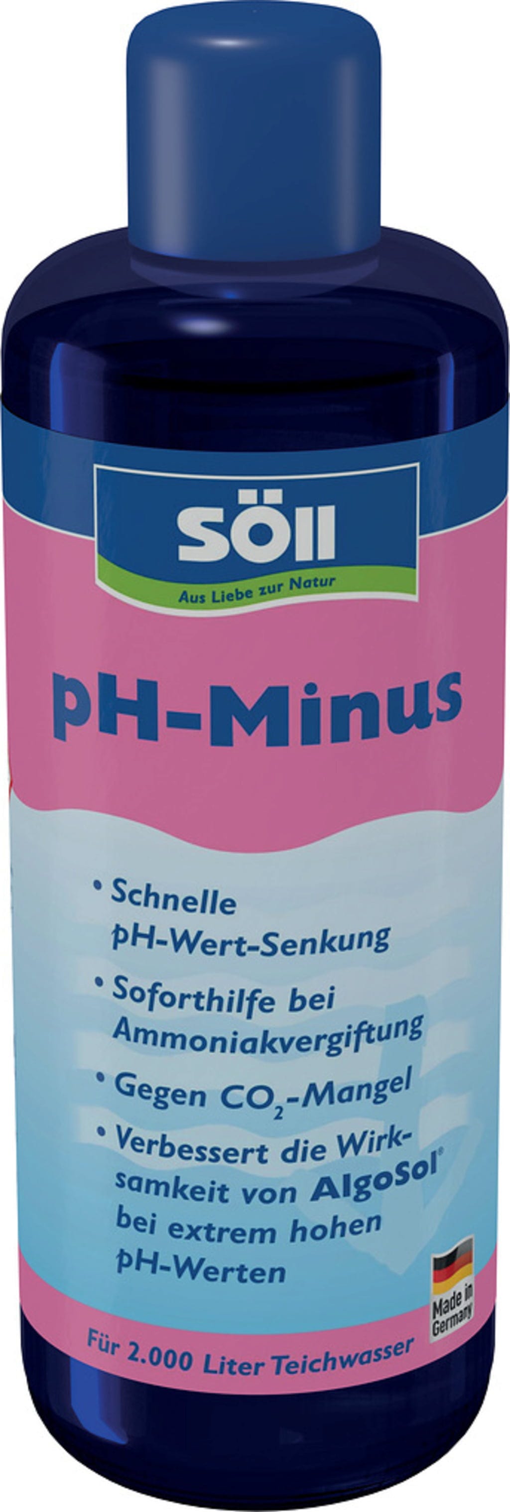 Als de pH-waarde van jouw vijver boven de 8,5 komt, biedt pH-Minus van Söll je de nodige directe hulp om gevaarlijk ammoniak onmiddellijk te neutraliseren. Tegelijkertijd bestrijd je CO2-tekort bij je waterplanten, waardoor ze weer optimaal voedingsstoffen kunnen opnemen en krachtig kunnen groeien.