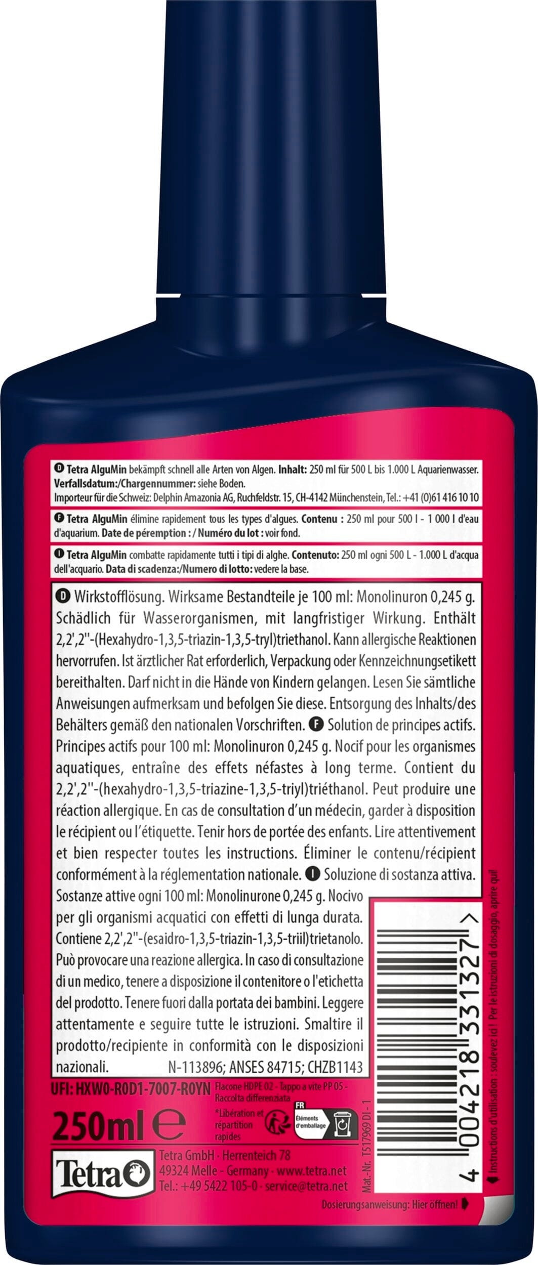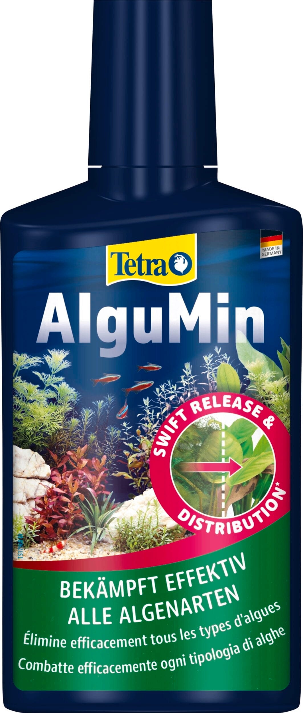 Tetra AlguMin is een vloeibaar anti-algenmiddel dat wordt gebruikt om beginnende algenproblemen in zoetwateraquaria te bestrijden. AlguMin wordt gekenmerkt door een breed werkingsspectrum tegen alle veelvoorkomende algensoorten, waarbij humusstoffen worden gebruikt als natuurlijk werkzaam bestanddeel tegen algen.