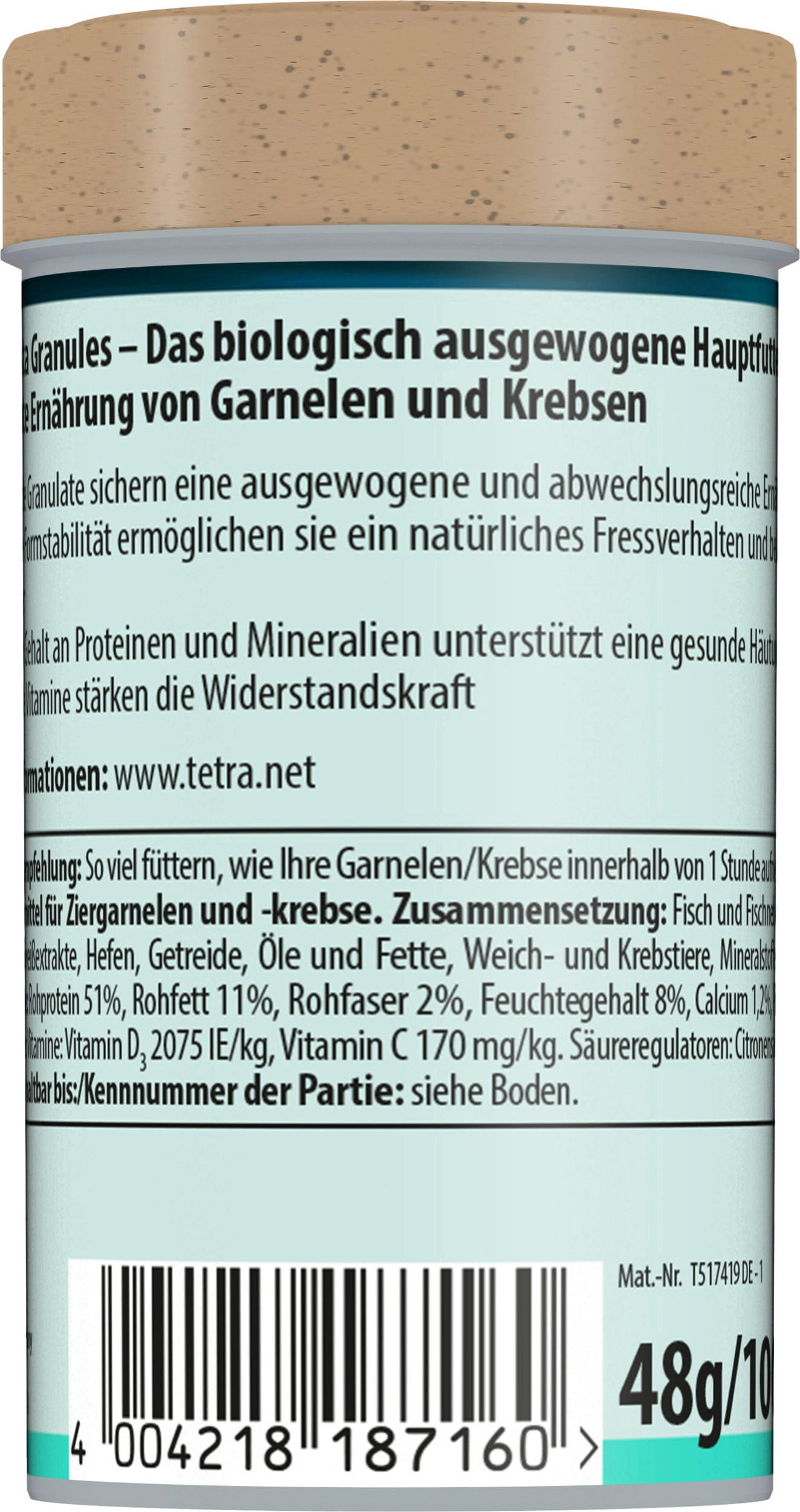 Tetra Crusta Granules is een granulaatvoer voor krabben en garnalen. De korrels met hoogwaardige carotenoïden zinken dus geschikt voor deze soorten. Het voer van Crusta Granules zorgt voor een soortspecifieke en gevarieerde voeding. Door hun vormvastheid zorgen ze ervoor dat garnalen en rivierkreeften op natuurlijke wijze kunnen eten en vervuilen ze het water niet. Hun optimale eiwit- en mineralengehalte zorgt voor een gezonde voeding.