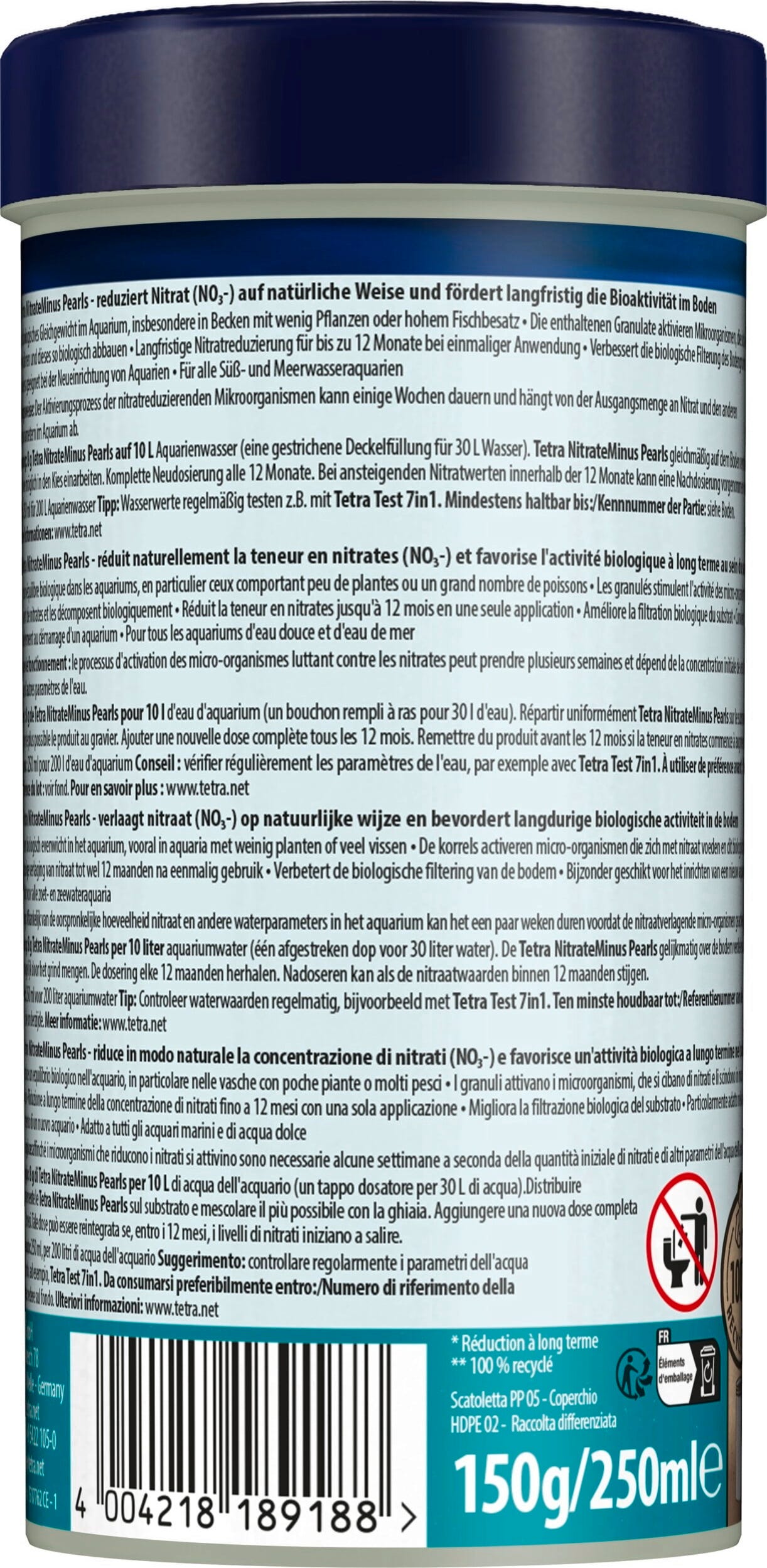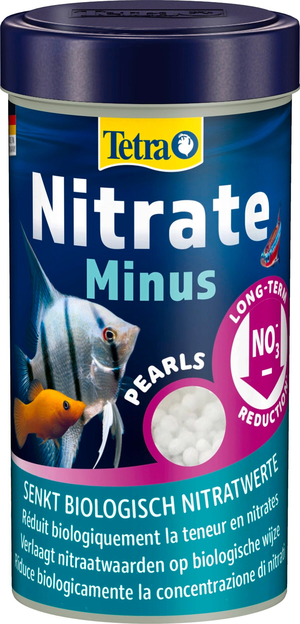 Tetra NitrateMinus Pearls wordt gebruikt om het nitraatgehalte in nieuw ingerichte zoet- en zeewateraquaria permanent te verlagen. Doordat het granulaat optisch in het substraat past en continu door bacteriën wordt afgebroken, garandeert het tot 12 maanden een puur biologische nitraatreductie, wat leidt tot een verbetering van de waterkwaliteit op lange termijn. De algengroei wordt aanzienlijk beperkt door het onttrekken van voedingsstoffen. Afhankelijk van de aquariumomstandigheden is een verlaging van het nitraatgehalte van 40-50 mg/l mogelijk. Tetra NitrateMinus moet elke 12 maanden opnieuw worden gedoseerd en een aanvullende dosis tot het dubbele van de hoeveelheid is op elk moment mogelijk om de effectiviteit te vergroten.